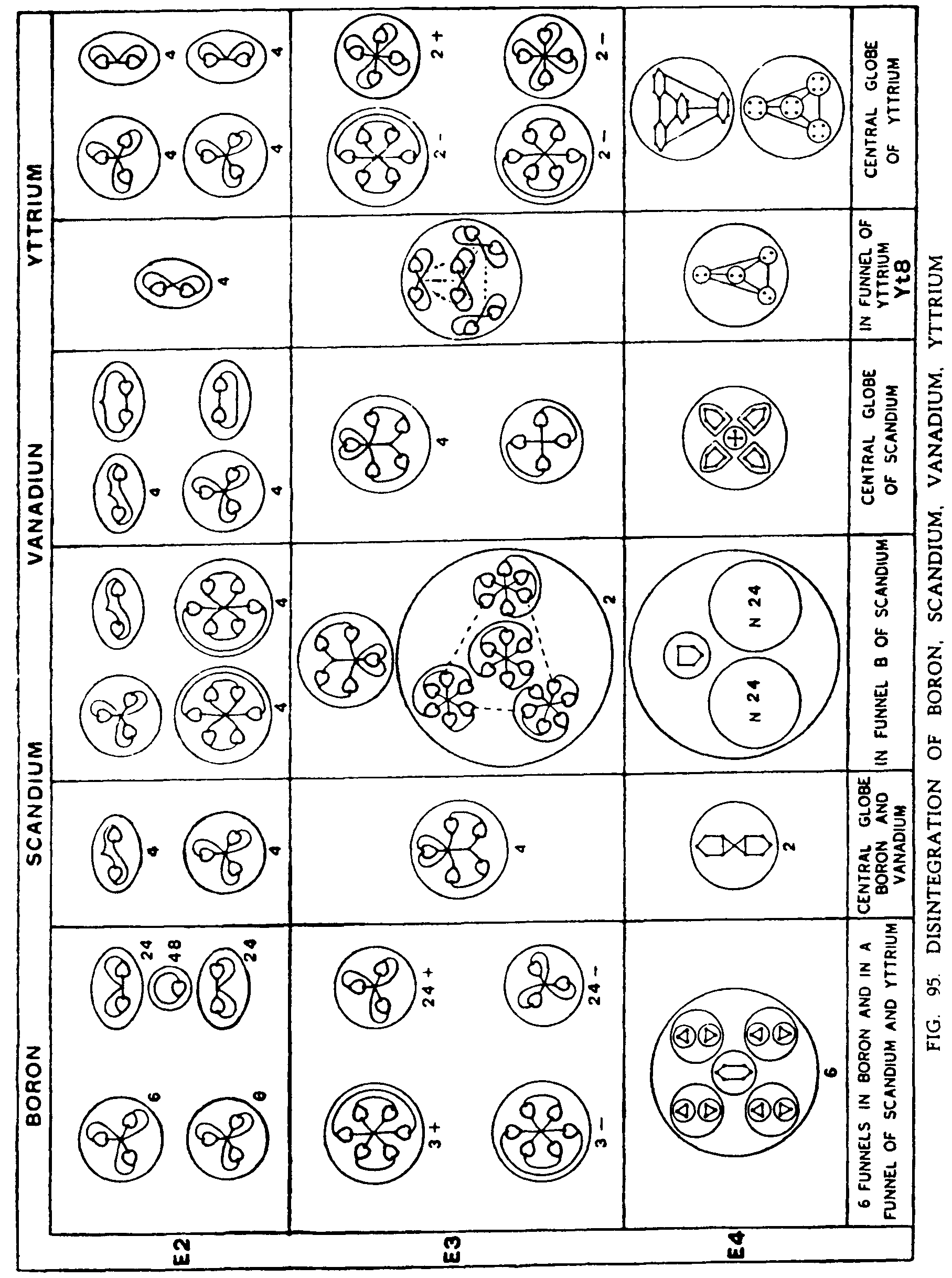 The Central globe shows a cross at its centre, with the four quintets whirling round it, on the E4 level. On the E3 level the quintets are set free and follow the Boron type, while the cross becomes a quartet. On the E2 level each quintet gives a triplet and a duad and the quartet two duads. Fig. 95.