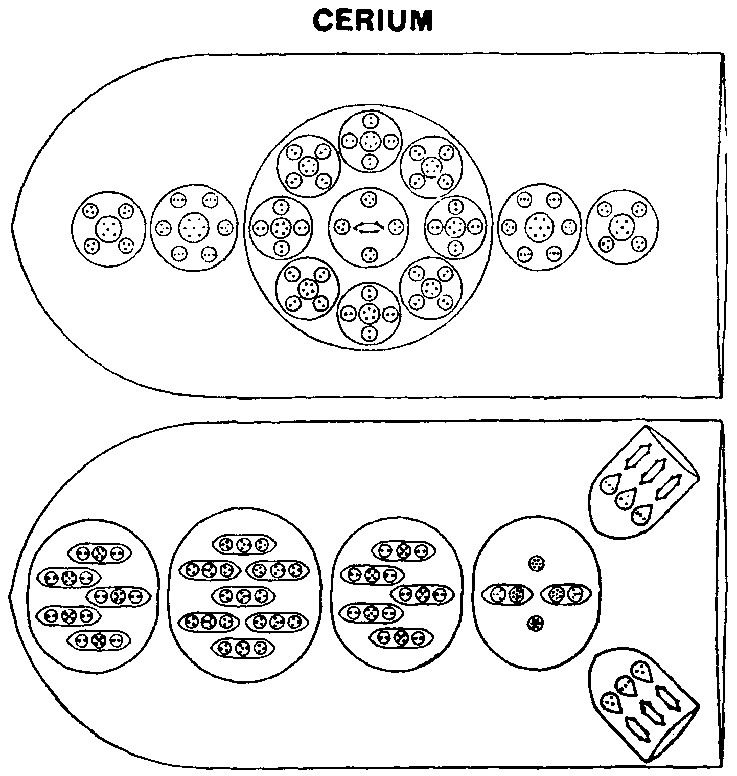 Type B. These funnels are very similar to those in Cerium. We have first the Ca160, next the Ce36 group, and then the two funnels of Carbon, still without their linking Anu. In addition a small ovoid, Gell, containing two triplets and a quintet, floats at the mouth of the funnel The total number of Anu is 260.