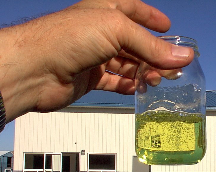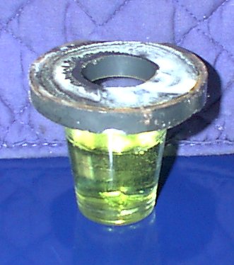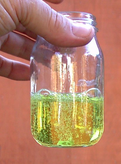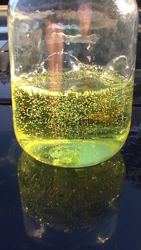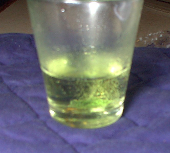 Sept. 17, 2000 - I just examined the green chloride again and noticed that there is a white precipitate in it. This precipitate is in a very small amount (about 3-5 ml in approximately 225 ml of liquid) at the bottom of the jar.