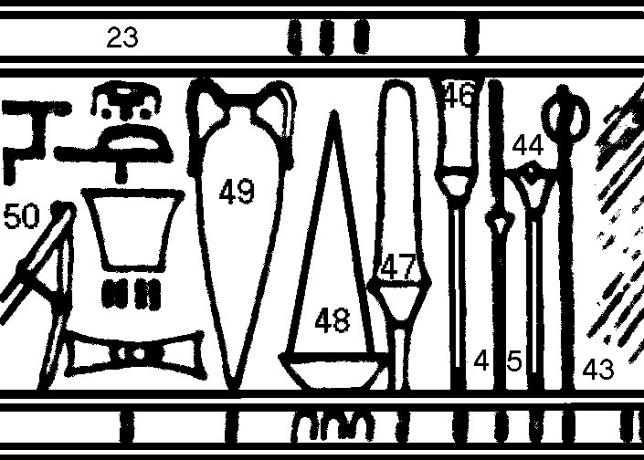 "Next to the altar was the table "whereupon the shewbread was" (I Kings 7:48; II Chronicles 4:19). The showbread was obviously not of flour, but of silver or gold; in the Book of Exodus12 it is said that showbread was made by Bezaleel, who was a goldsmith. Showbread is pictured on the bas-relief of Karnak in the form of a cone. The cone in the seventh row (138) bears the explanation: 'White bread." This bread was of silver. The thirty cones of gold (48) and the twenty-four cones of colored stone (malachite) (169), identical in form with the silver cone, also represent showbread."