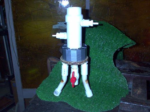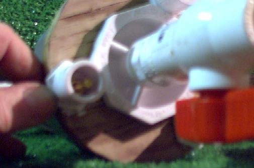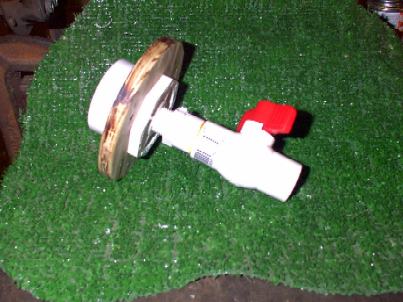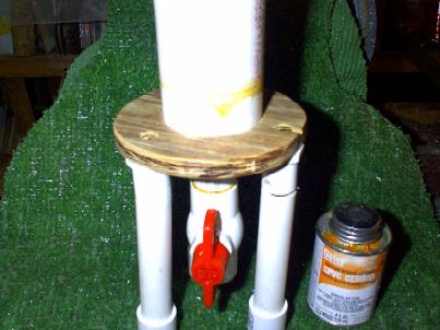 In operation, the valve will be turned nearly "off" to allow a trickle of water out. If you want to spend the money for a small brass needle type valve and fittings here feel free to substitute them. This valve cost about $2.00 and glued quickly in place. Adjusting it is a bit touchy though not difficult.