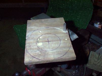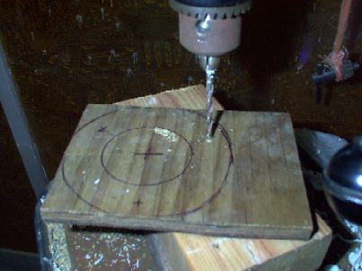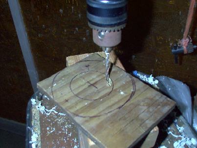 Make a leg mounting ring of exterior grade 1/2 inch plywood or acrylic sheeting. Start by drawing two concentric circles. The inside circle is to be 2 3/8 inches and the outer is to be 5 inches. Use a hole saw to cut out the inner circle if available. If not, drill starter holes as shown and use a saber saw or hand coping saw to finish the job.