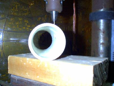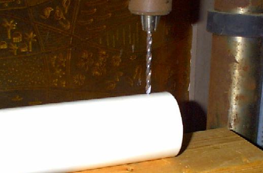 Now finish the main barrel. First drill the inlet hole. It is a 1/8 inch round hole drilled at a tangent to the side of the barrel. This is a must as it will cause the inlet water to slowly spin all the water in the entire barrel. Start the hole by aiming the drill 90 degrees at the pipe just enough to form a dimple. Finish by turning the drill to the tangent angle as shown. Mark one end of the barrel as "Top" and place this hole 4 inches down.