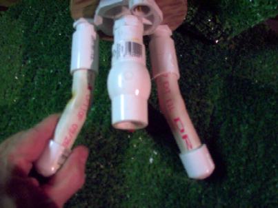 Note the legs. This was a prototype. Flexible rubber tubing was inside but this design did not prove stable. Use the 45 degree fittings, or straight couplings and bent legs.