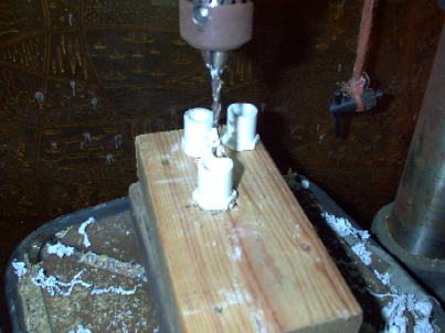 Install the leg mounts. The leg mounts are 1/2 inch diameter flat topped plugs. They are hollow. They must be drilled before use. Drill a 1/4 inch hole in the center of each.