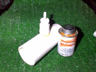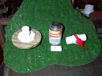 The outlet consists of the 2 inch piece of 1/2 inch pipe and the valve. Glue the short pipe into the valve and then glue these parts into the fitting threaded into the base.