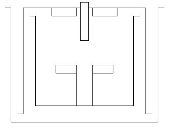 Here is a diagram of the cross section of the completed trap showing the three interlocked pots, the inlet/nozzle assembly and the two magnets (the x shaped piece in the bottom of the 16 inch pot is not shown for clarity):