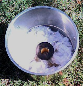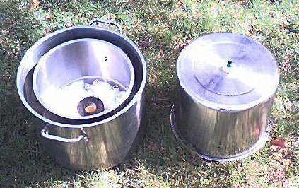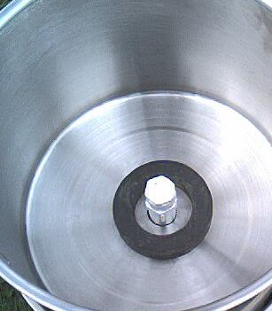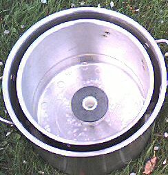 Check the fit of this completed assembly. It should slip easily into the 8 quart stock pot. Glue the bottom of this assembly to the inside bottom of the 8 quart stock pot using the silicon sealer. The acrylic circle should keep the pedestal centered while the silicon hardens. Allow the silicon to set for 8 hours.