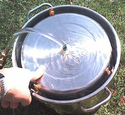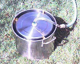 The inlet assembly is constructed from the PVC pipe parts and the O rings. Insert the close nipple into the hole in the center of the bottom of the mid sized (12 inch) stock pot and put both O rings on the nipple from each side. One of the PVC threaded couplers threads onto the part of the nipple projecting from the outside of the stock pot and the other threads onto the inside. The portion of this assembly which passes through the lid should be tightened with wrenches. You should use Teflon tape on these joints if you wish to take them apart later.