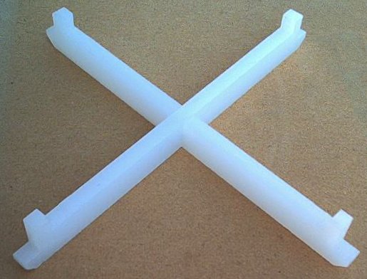 You will need an x-shaped spacer to keep the inner 8 quart stock pot from resting on the bottom of the outer 16 quart stock pot. You can build this by cutting two half inch thick pieces of acrylic or other plastic 1 inch wide by 16 inches long with a half inch deep notch out of both top corners of each end of them and a centered notch so that they can be assembled in a cross shape. These pieces will look somewhat like this: