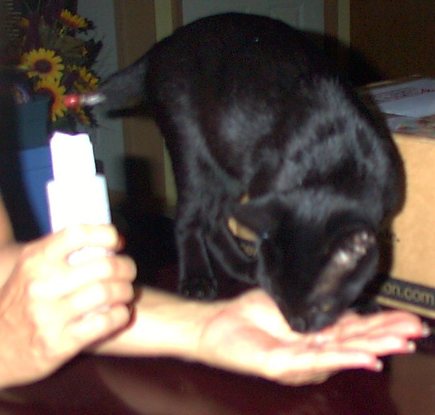 Dana started feeding Tut Liquid Chi and Prime Enzymes in his food. She also fed him Cleopatra's milk out of her hand. From that time to this Tut has not cried or made any sound except a loud purr. |